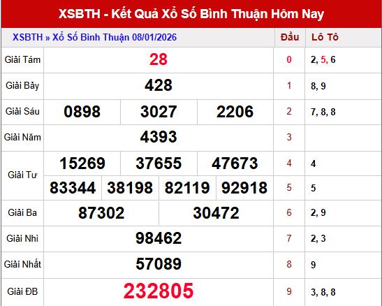 Tổng quan kết quả xố số Bình Thuận ngày 8/1/2026
